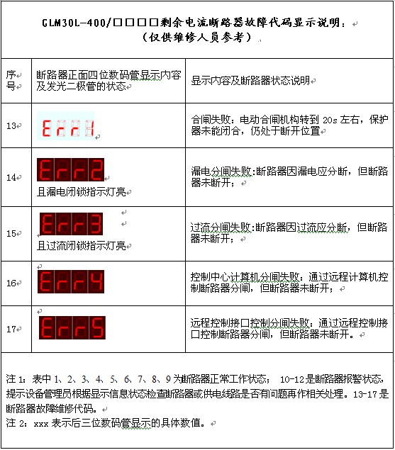 一、产品简介 GLM30L-400/□□□□剩余电流动作断路器(以下简称断路器),内部由三相四线或三相四极智能电子过流型断路器组成。产品具有漏电、电子过流、短路保护功能;留有RS-485通信接口,可实现远程控制,工作电流在400A以下的智能型电力负荷开关。 产品符合GB14048.2等标准的要求。支持DL/T645多功能电能表通信协议。 产品有电动操作和手柄操作两种供用户选择。 二、产品用途 产品用于额定电压380V/50Hz工作电流在400A以下,三相四线、三相三线动力及2V单相照明电路中,作人畜接触带电体起间接补充保护使用。产品对供电线路、用电设备有漏电、过载、短路保护作用。产品留有RS-485接口,作为预付费电度表控制开关、各种信息远程控制与传递之用。产品结构可靠,安装方便,适用于工矿企业,移动用电场所,电网转换的多级保护。 产品在供电线路中根椐需求可作总保护,也可作分路保护。 三、技术参数 3.1额定工作电压:AC 380V 50Hz 3.2额定电流:AC 0A、250A、315A、350A、400A(可调) 3.3额定辅助电源电压:AC 2V 50Hz 3.4额定剩余动作电流:AC 50mA、 100mA、300mA、400mA、500mA(可调) 3.5额定剩余不动作电流:AC 25mA、50mA、150mA、0mA、250mA 3.6额定极限短路分断能力:AC H型50kA S型35kA 3.7额定剩余动作电流分断时间:0.3s、0.5s 3.8动作特性:AC型 3.9合闸时间: 电动合闸的小于10s;自动重合闸的时间为-60s。 四、产品尺寸与结构 手柄操作产品尺寸图 电动操作产品尺寸图 五、工作条件 5.1 适应在环境温度为-5℃- +40℃;相对湿度<90%;海拔不超过 00米。 5.2 断路器应安装在干燥、通风、防尘、防止有害气体、远离磁场、防止震动、太阳直晒,雨水侵蚀,固定在一定高度便于操作的地方。 六、安装断路器 6.1 请参照断路器接线图接线。 6.2 断路器应垂直安装,严禁水平或倒置安装,用螺钉通过安装孔固定。 6.3 产品上侧1、3、5、N为电源进线侧,分别对应相线C、 B、A和电源中性线(零线)N,下侧2、4、6、N为负载侧接线。 6.4 电源进出线应选用足够面积的过渡接线装置或导线(导线截面积:0A>50mm2 ,400A>100mm2 ),进出导线的绝缘电压大于500V,以满足断路器及用户负载的使用要求。 6.5 接线螺丝力度要适度,以防止接线螺丝松动,烧坏接线端装置。 七、功能介绍与操作使用 7.1 三个断开指示,显示断路器的内部工作状态,弹出为断开,吸入为接通。 7.2 手动断开:在无辅助电源或电源电压有故障及其它紧急情况下,强行按手动断开按钮,开关能迅速断开。(注:电动操作型同时应将断路器面板电上的源开关置于断开位置,防止由于电源停电复送电造成二次合闸)。 7.3断路器正面两只指示灯作用: 电源接通(绿灯)――指示灯亮表示供电侧电源接通; 合闸送电(红灯)――指示灯亮表示断路器,经手动或电动合闸后,断路器内部开关已接通并向负载送电。 7.4 漏电试验按钮:用来对断路器施加一定量的漏电电流,验证断路器是否可靠动作。 7.5剩余动作电流设定:旋转面板上剩余电流动作设定(mA)旋转开关,手柄上的箭头所指定位点参数即为设定的剩余电流动作值; 7.6工作电流设定:旋转面板上工作电流设定(A)旋转开关,手柄上的箭头所指定位点参数即为设定的工作电流值。 7.7内藏三个功能拨动开关: ①漏电保护退出:当保护器内藏开关拨到退出位置,保护器无漏电保护功能,只做过流及短路保护用。 注意:退出功能供专业人员在检修电路故障时使用外,其他人员请勿使 用此功能。 ②过流退出选择:当保护开关拨到退出位置, 保护器无过电流保护作用,只作漏电及短路保护用。 ③分断时间0.3s、0.5s选择:断路器检测到剩余电流到断路器分断的时间选择0.3s、0.5s,合理的选择分断时间可以避免断路器的越级动作。 7.8主要工作状态描述:①自动跟踪的投入与退出:当断路器面板上剩余电流动作设定(mA)旋转开关手柄箭头指向自动跟踪时,漏电保护的整定值将根据线路的实际情况在50mA~500mA自动调整,若手柄箭头转离此处则自动跟踪功能退出,剩余电流动作值遵循手动设定值。(详见附录A) ②通信的投入与退出:当断路器面板上工作电流设定(A)旋转开关手柄箭头指向通信投入时,断路器的剩余电流动作值及工作电流设定值将按通过RS485通信设置的参数运行,旋转开关设置无效。若手柄箭头转离此处则通信功能退出。 7.9两组数码管:显示断路器工作状态及故障代码。(详见附录B) 7.10送电、试验 7.10-1 经检查接线无误后方可送电试验,接通供电侧电源,断路器面板上的电源接通灯亮,再经手动或电动合闸后,三个断开指示自动吸入,其断路器内部已接通(此时应能听到“啪”的一声合闸声),送电合闸灯亮,并向负载侧送电。 7.10-2试验:。 ▲ 电动操作型:轻按漏电试验按钮、断路器应立即分断经-60 s重合闸后,5秒内再按漏电试验按钮,断路器应立即分断并闭锁.不再自动重合。 ▲ 手柄操作型: 轻按漏电试验按扭、断路器立即分断并显示闭锁 7.11 产品在按规程安装送电试验正常后,应将功能开关盖板用封签封上,非专业人员不得擅自打开。 八、敬告 8.1本产品功能选择请按GB13955-05《剩余电流动作保护装置安装和运行》或DL/T499-01《农村低压电力技术规程》中相关要求使用。 8.2请您严格按照相关规程对本断路器进行安装、试验、使用,并定期定量试验,(建议一周作一次以上试验,并作书面记录),新安装的剩余电流断路器、需要专用的剩余电流动作断路器测试仪,进行